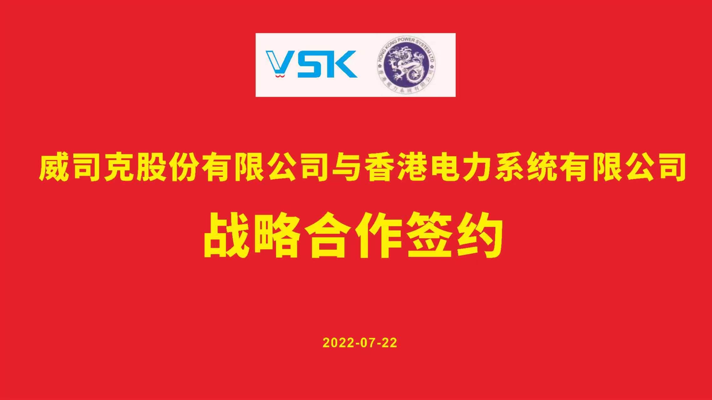 2022年7月22日,威司克股份有限公司与香港电力系统有限公司共聚 VSK 贵宾厅,双方就电力系统智能化新产品项目开发共同签署战略合作协议。双方本着“优势互补、资源共享、共创共建、合作双赢”的原则展开战略性合作,···