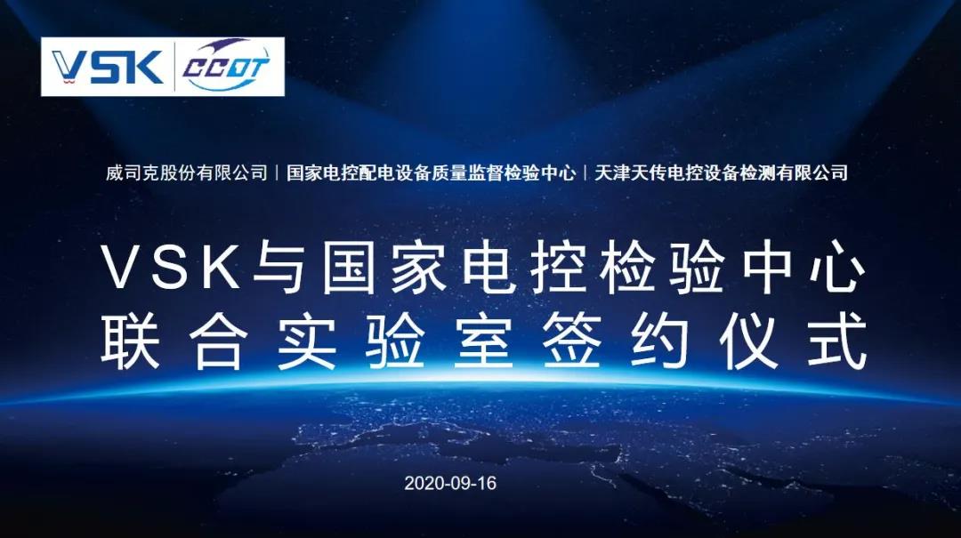 2020年9月17日下午,VSK与国家电控检验中心,天津天传电控检测有限公司共同建立联合实验室暨签约仪式在VSK电气产业园多功能厅成功举行。VSK董事长郑巨式先生和国家电控检验中心天津天传电控设备检测有限公司副总经理···